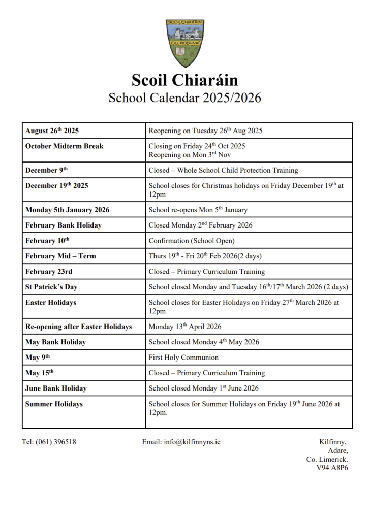 Scoil Chiaráin is more than just a school – it’s a close-knit community where families, staff, and students work together. We believe in building strong partnerships between home and school.