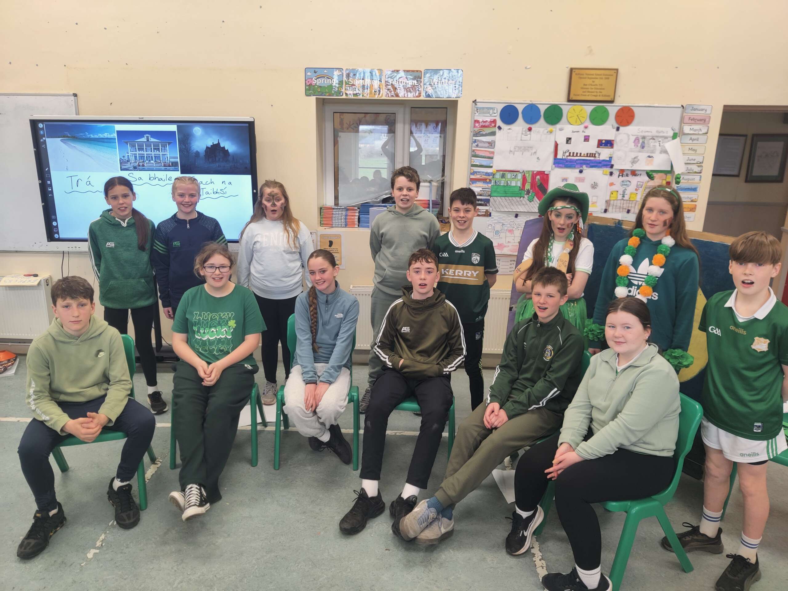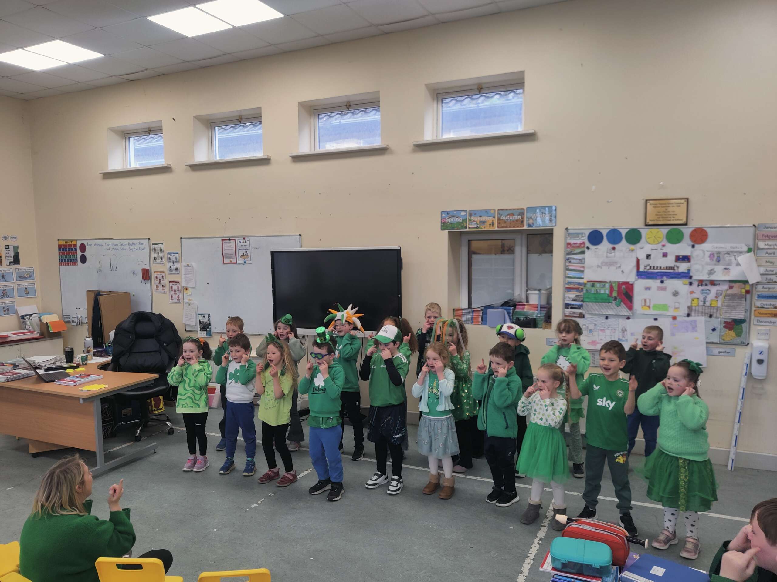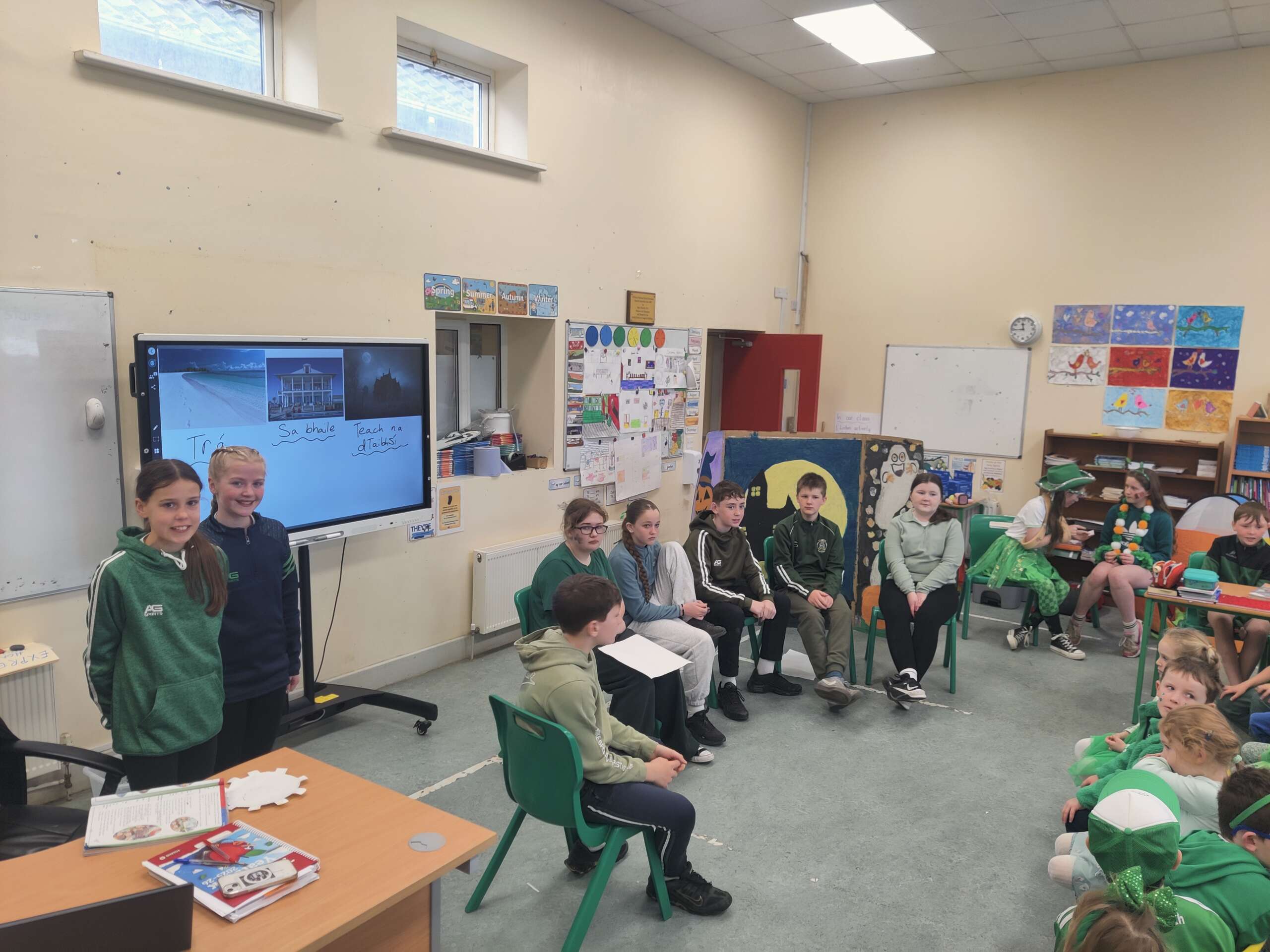 Bhí am tharr barr againn ag ceiliúradh ár dteanga is ár gcultúr an tseachtain seo. We had lots of different activities – a whole school table quiz as Gaeilge, watching some cartoons on Cúla 4, traditional songs and read alouds of Irish stories. We also joined lots of other schools across Ireland for an online movement break. On Friday we held our Lá Glas, with drama, music and dancing. All of this ties in nicely with our Gaelbhratach work. Thank you to all the pupils and staff for their enthusiasm with these events, and in particular Mrs O’Mahony, our Gaelbhratach co-ordinator. Enjoy the photos in the slideshow and a selection of videos below that.